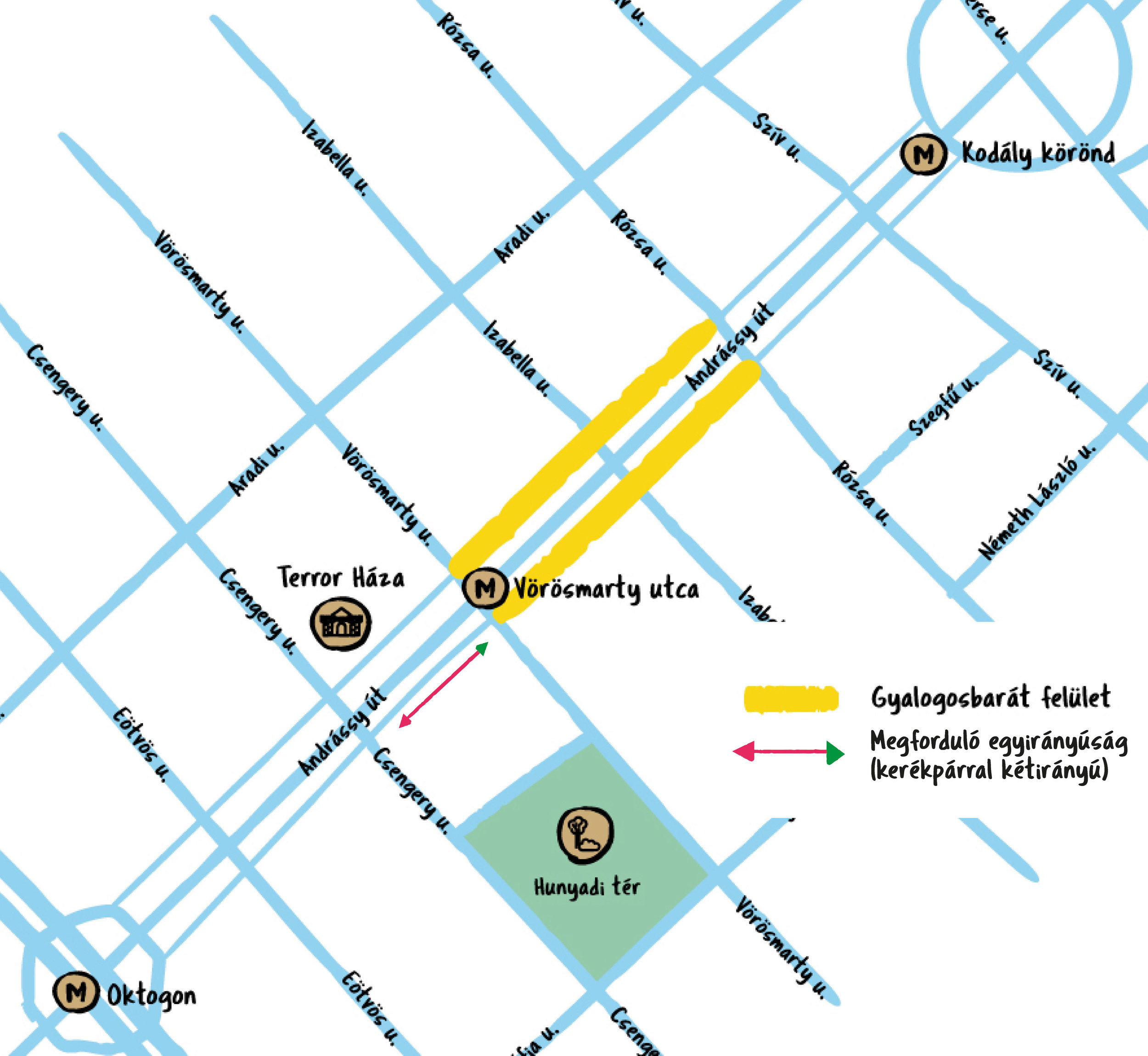 - Az Andrássy út Vörösmarty utca és Rózsa utca közötti szakaszán a szervizutak közösségi térré válnak 2020. augusztus 1. és október 18. között.