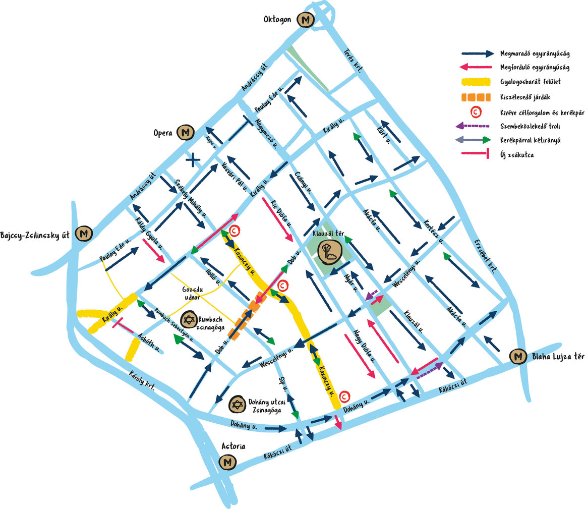 - Tempo30 zóna részévé válik az Andrássy út – Nagymező utca – Király utca – Erzsébet körút – Wesselényi utca – Károly körút – Bajcsy-Zsilinszky út által határolt terület, ezen útszakaszok nélkül